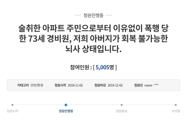 청와대 국민청원 홈페이지에는 2일 ‘술 취한 아파트 주민으로부터 이유 없이 폭행당한 73세 경비원, 저희 아버지가 회복 불가능한 뇌사 상태입니다’라는 제목의 청원이 게재됐다.