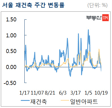 또 전국적으로도 재건축 아파트 매매값이 한 주 새 0.10% 하락했다. 신도시를 제외한 경기·인천 지역 재건축 아파트 매매값만 같은 기간 0.15% 오른 것으로 조사됐다.