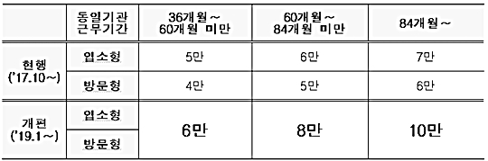 개편안에 따라 내년부터 7년 차 종사자는 월 10만 원에 해당하는 금액이 지급받게 되며, 그동안 분리돼 있던 입소형·방문형 지급액도 하나의 지급액으로 통일된다.
