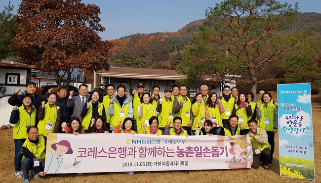 NH농협은행은 6일 코레스은행 임직원을 초청해 경기도 가평 아홉마지기 마을에서 농촌일손돕기를 진행했다. 코레스은행은 환거래계약이 서로 체결된 은행을 말한다.