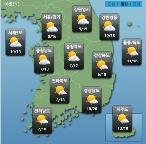 기온은 평년과 비슷하거나 조금 높을 전망이다. 아침 최저기온은 2∼11도, 낮 최고기온은 14∼20도로 예상됐다. 서울은 최저 8도, 최고 16도겠다.