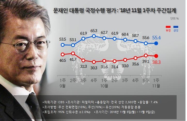 여론조사기관 리얼미터가 CBS 의뢰로 지난 5∼9일 전국 유권자 2503명을 대상으로 실시한 설문조사(신뢰수준 95%에 표본오차 ±2.0%포인트)에 따르면 문 대통령 국정수행에 대한 긍정평가는 전주보다 0.2%p 내린 55.4%로 집계됐다.
