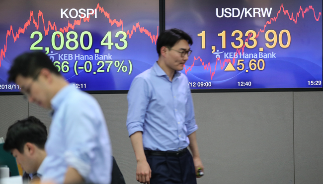 코스피는 장중 한때 20.17p(0.97%) 내린 2065.92까지 떨어졌지만 외국인과 기관이 매수로 돌아서면서 낙폭을 만회했다. 이날 개인은 1154억원 순매도, 외국인과 기관은 각각 387억, 676억 순매수했다.