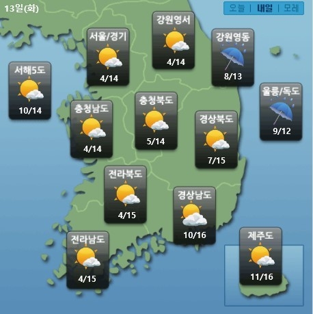 남부지방에는 가끔 구름이 많고, 경북내륙은 13일 낮부터 오후 사이 5㎜ 미만의 비가 내리겠다. 전라 동북내륙과 경남에는 오후부터 밤사이 빗방울이 떨어지는 곳도 있겠다.