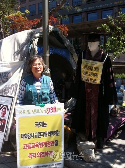김동애 전국대학강사노동조합 지도위원은 “지난 1977년 박정희 정권에서 군사독재 강화를 위해 강사의 교원 지위를 박탈했다. 대학 교육의 절반을 맡고 있는 강사들은 41년간 법적 신분을 보장받지 못하고 열악한 처우에서 일해왔다”며 “강사법 개정안 시행을 통해 강사들의 ‘신분 해방’이 이뤄져야 한다”고 강조했다. 그는 “이번 개정안은 강사와 대학, 전문가가 회의를 거쳐 합의한 것이라는 데 의미가 있다”고 설명했다. 김 지도위원은 남편인 김영곤 전국대학강사노동조합 대표와 함께 지난 2007년부터 국회 앞에서 텐트 농성을 진행해왔다.