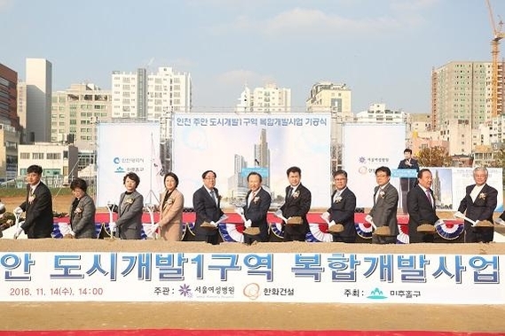 기공식에는 김정식 미추홀구 구청장과 허종식 인천부시장, 오익환 서울여성병원 원장, 홍일표 자유한국당 국회의원, 최광호 한화건설 대표이사, SMC피에프브이 관계자 등과 지역 주민 등 300명이 참석했다.
