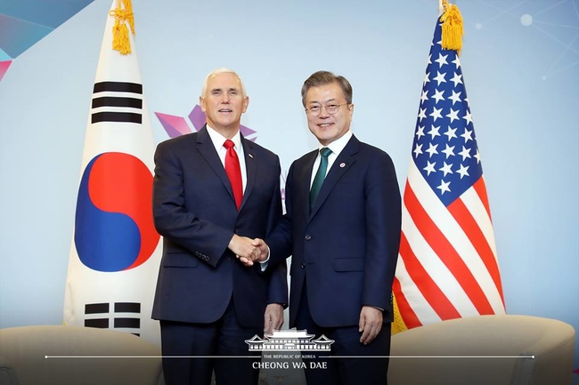 문재인 대통령이 마이크 펜스 미국 부통령을 만나 한·미간 확고한 신뢰를 바탕으로 한반도의 완전한 비핵화와 항구적 평화를 위해 긴밀히 공조해 나가기로 했다. 또한 북미관계 진전이 가속화될 수 있도록 적극적인 역할을 계속 해 나가기로 했다.