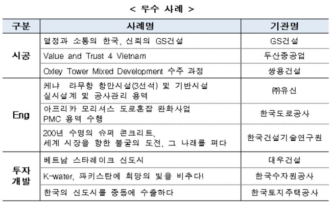 수상작에 대해서는 연말에 해외건설 우수사례집을 작성해 배포하고, 우수사례 기여도가 높은 개인에는 연말 장관 표창 시 가점을 부여할 계획이다.