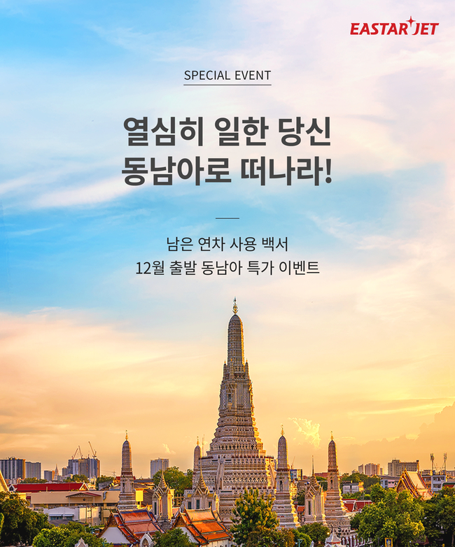 이스타항공, 연말 해외 여행을 위한 동남아 노선 특가 이벤트 = 이스타항공이 19일 오후 2시부터 오는 25일까지 일주일 간 연말 해외여행 고객들을 위한 동남아 노선 특가 항공권 이벤트를 진행한다. 탑승기간 12월1일부터 12월31일까지 출발 가능한 항공편을 대상으로 하며 12개 동남아 노선에 대해 편도총액 최저가 9만900원부터 구매할 수 있다. 12개 노선은 인천, 김포 등 수도권 공항뿐만 아니라 청주, 부산, 제주 등 지방공항에서 출발 가능한 노선도 포함돼 있다. 이스타항공 관계자는 “연말을 맞아 직장인들을 위한 동남아 노선 특가 이벤트를 기획했다”며, “남은 연차를 알차게 활용하여 추운 겨울 따뜻한 나라로 여행을 계획해보시길 바란다”고 말했다.