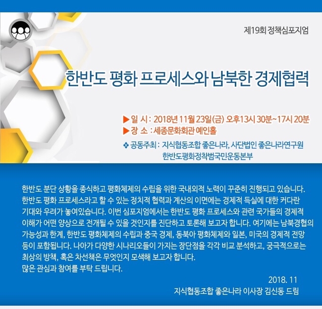 지식협동조합 좋은나라는 23일 오후1시 세종문화회관 예인홀에서 ‘남북한 경제협력’을 주제로 제19회 정책심포지엄을 개최한다고 밝혔다.