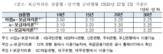 이에 따라 주택금융공사 홈페이지에서 신청하는 u보금자리론과 은행 창구에서 신청하는 t보금자리론은 대출만기에 따라 연 3.10%(만기 10년)∼3.35%(30년)로 이용할 수 있다.