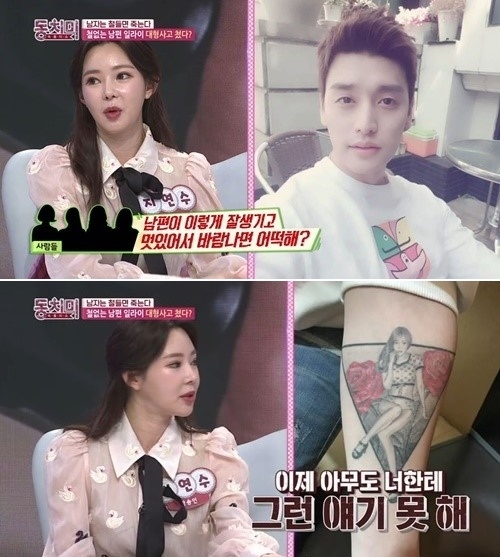 레이싱모델 지연수가 남편인 그룹 유키스 멤버 일라이가 팔에 자신의 전신사진을 문신으로 새겼다고 말했다.