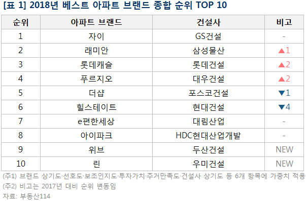자이에 이어 삼성물산의 래미안, 롯데건설의 롯데캐슬, 대우건설의 푸르지오, 포스코건설의 더샵이 5위권 내에 들었다. 이 밖에 중견건설사인 우미건설의 린이 올해 처음 10위권 내에 진입했다.