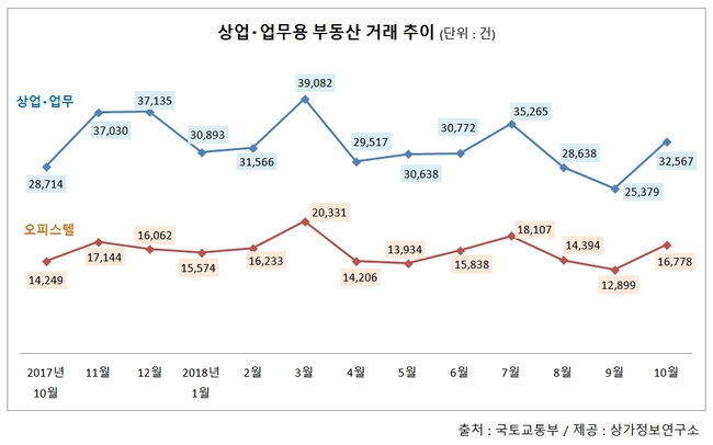 27일 상가정보연구소가 국토교통부 통계를 분석한 결과, 지난 10월 상업·업무용부동산 거래건수는 3만2567건으로 전월(2만5379건) 대비 28.3% 증가했다. 전년동기(2만8714건)에 비해서는 13.4% 늘었다.