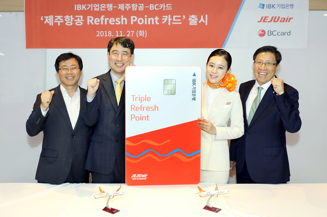 제주항공, Refresh Point 카드 출시 = 제주항공은 IBK기업은행ㆍ비씨카드와 함께 ‘제주항공 Refresh Point 카드’를 출시한다고 28일 밝혔다. 서울시 강서구 제주항공에서 전날 오후 이석주 제주항공 대표이사(사장)과 정재섭 IBK기업은행 부행장, 김진철 비씨카드 마케팅부문장 등이 참석한 가운데 ‘제주항공 Refresh Point 카드’ 출시 및 공동마케팅을 위한 업무 협약식을 실시했다. 주요 서비스는 ▲리프레시포인트 적립 ▲여행관련 서비스 제공 ▲제주항공 기내 에어카페 청구 할인 등이다. 리프레시포인트는 1000원당 10포인트를 적립해주고 전월실적에 따라 1000원당 최대 30포인트까지 적립이 가능하다. 전월실적이 30만원 이상인 경우 제주항공 기내 에어카페 최대 3000원 할인, 국내 공항라운지 및 인천공항·김포공항 발렛파킹 서비스 등이 제공된다. 출시를 기념해서 카드 발급 후 2019년 2월말까지 사용한 고객을 대상으로 경품이벤트를 진행한다. ▲1등(1명) 리프레시포인트 200만포인트(200만원상당) ▲2등(5명) 20만포인트(20만원상당) ▲3등(10명) 5만포인트(5만원상당)를 각각 증정한다. 또 연말까지 20만원이상 해당 카드로 결제하고 2019년 6월까지 탑승한 고객 전원에게는 리프레시포인트 5만포인트를 추가 적립해 준다. 포인트 적립은 기간 중 1회 제공하며 중복제공은 불가하다.