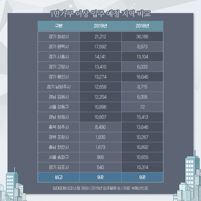 입주물량이 1만 가구 이상 되는 시·군·구는 총 9곳으로 올해와 같다. 특히 올해 3만6000여가구가 입주한 경기 화성시는 새해에도 2만1212가구가 입주를 기다리고 있다. 이어 경기 평택시, 시흥시 등의 입주물량이 많으며, 비수도권 지역 가운데에서는 경남 김해시가 1만2204가구로 입주물량이 가장 많다.