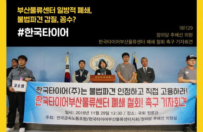 이어 “한국타이어가 조속히 사태해결에 나서고, 고용노동부 또한 불법파견 여부를 포함한 특별근로감독을 즉각적으로 실시해야 한다”고 강조했다. 이어 “한국타이어의 브랜드에는 물류센터 협력업체 직원들의 눈물과 땀도 녹아있다는 사실을 명심해 달라”고 강조했다.