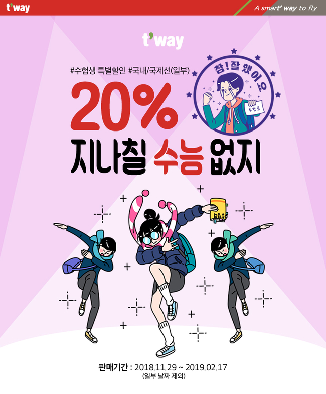티웨이항공, 수험생을 위한 20% 운임 할인 시행 = 티웨이항공이 수험생들을 위한 특별운임 할인을 진행한다. 지난달 15일 진행된 대학수학능력시험에 응시한 수험생들을 대상으로 20%의 항공권 운임 할인을 내년 2월17일까지 제공한다. 할인이 적용되는 노선은 김포, 대구, 광주, 무안에서 제주로 가는 국내선을 비롯해 일본, 마카오, 홍콩, 블라디보스토크의 일부 국제선까지도 가능하다. 할인은 수험생 본인에 해당된다. 티웨이항공의 홈페이지와 모바일 앱, 웹을 통한 항공권 예약 시 개인신분할인에서 '수험생 할인'을 선택하면 된다. 탑승 시 반드시 본인의 수험표, 대입 지원서, 원서 접수증 중 1개를 지참해야 한다.