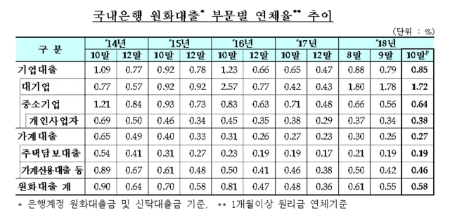 금감원이 11일 발표한 ‘2018년 10월 말 국내은행의 원화대출 연체율 현황'에 따르면 10월 말 현재 국내은행 원화대출 연체율은 0.58%로 전월 말 보다 0.03%p 상승했다.
