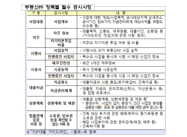 특히 PF대출의 경우 PF사업의 차주·시행사·시공사 재무·실적 정보 등 PF사업 전반에 대한 내용은 물론 사업에 대한 변호사 등 외부전문가의 검토 내용도 공시해야 한다.