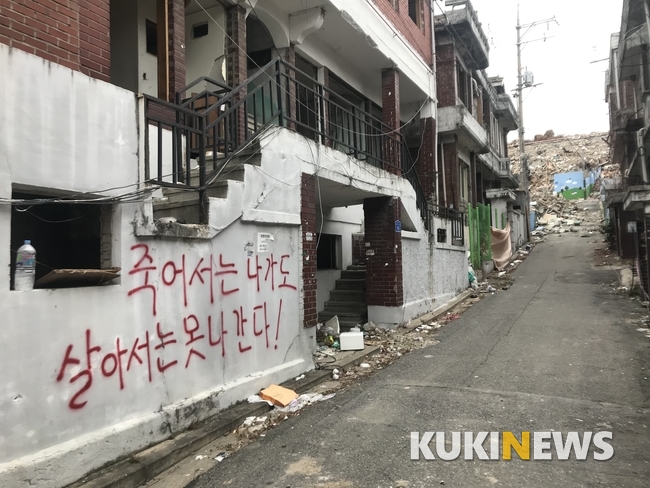 해당 집을 뒤로 한 채 염리동쪽으로 이어지는 길목을 따라 좀 더 걸었다. 길가에서 만난 아현동 옆 염리동에 거주하는 한 주민은 “아현동 재개발 지역은 너무나도 폐허가 돼서 몇 가구가 살고 있는지 도저히 파악할 수 없는 수준”이라며 “20가구가 남았다는 사람도 있고, 15가구가 남았다는 사람들도 있고, 저마다 소문으로만 떠들고 있다”고 말했다.