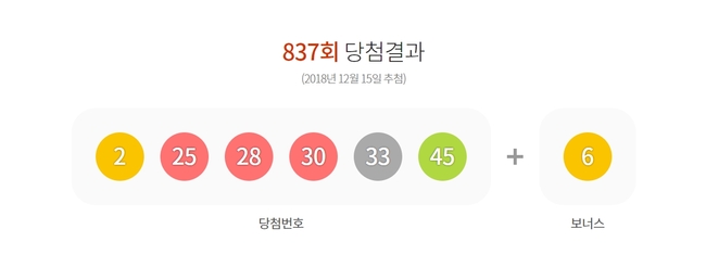 '837회 로또' 당첨번호는 2, 25, 28, 30, 33, 45번 이다. 보너스 번호는 6번으로 추첨됐다.