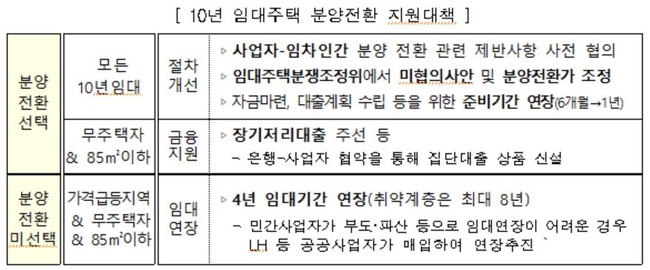 이번 대책은 높은 분양전환 가격으로 인한 자금 조달문제 등으로 전환이 어려운 임차인의 주거불안 해소를 위한 지원이 필요하다는 배경에서 마련됐다.