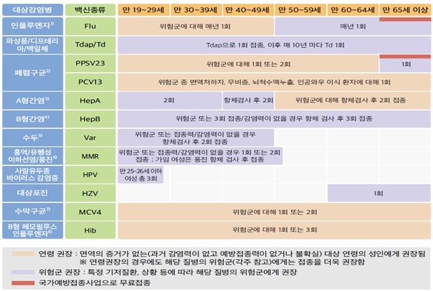 건강한 성인은 만 50세 이상은 인플루엔자, 만 65세 이상은 페렴구균, 모든 성인은 매 10년마다 파상풍・디프테리아・백일해 접종을 권고했다. 만 60세 이상은 대상포진, 만 20~39세는 A형 간염을 권고했다.