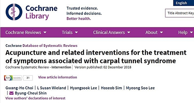 최근 근거중심의학을 표방하며 세계적 권위를 인정받고 있는 코크란 리뷰(Cochrane Database of Systematic Reviews) 12월호에 손목터널증후군에 대한 침 치료 효과를 검증한 체계적 문헌고찰 논문이 발표됐다. 저자로는 양산부산대 한방병원 신병철 원장을 비롯해 한국한의학연구원, 경희대한의대, 미국 메릴랜드의대 등 국내외 연구자들이 참여했다.