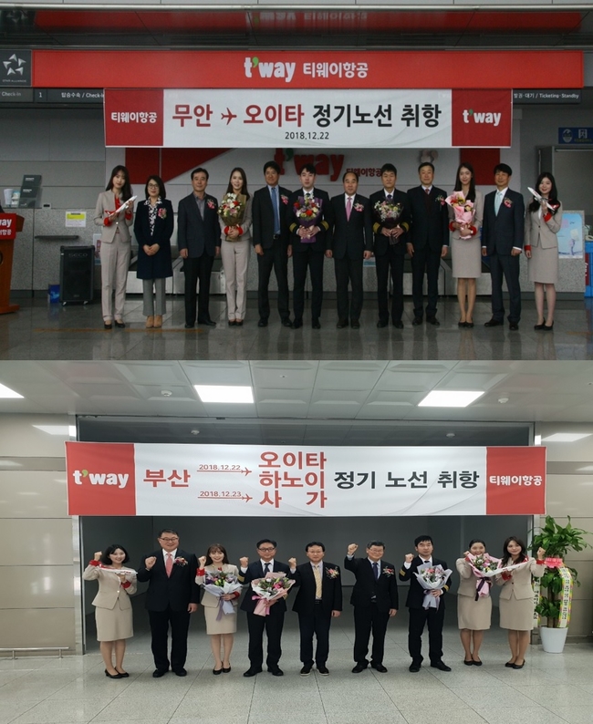티웨이항공, 부산발 3개·무안발 1개 국제선 취항 = 티웨이항공은 지난 22일 김해국제공항과 무안국제공항에서 각각 신규 취항식을 가졌다고 24일 밝혔다. 이날 하루에만 총 4개 노선(부산-사가, 부산-오이타, 부산-하노이, 무안-오이타)을 새롭게 취항했다. 티웨이항공은 확고히 자리잡은 대구국제공항을 필두로 올해 부산과 무안까지 노선을 늘렸다. 티웨이항공 관계자는 "티웨이항공은 앞으로도 전국 어디서나 해외 여행을 떠날 수 있는 하늘길을 넓힐 것"이라며, "내년에도 적극적인 노선 확대를 통해 고객 사랑에 보답하고자 한다"고 말했다.