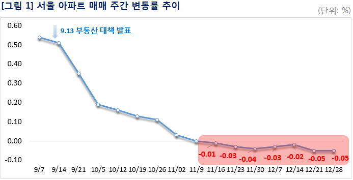올해 마지막주 서울 아파트값이 0.03% 떨어지면서 하락 마감했다. 지난 9·13대책 발표 이후 매수심리가 위축되면서 11월 3주차 하락 전환된 가운데 7주 연속 내림세가 이어지고 있다. 지난주 발표된 3기 신도시 예정지역의 아파트값은 보합세를 나타냈다.