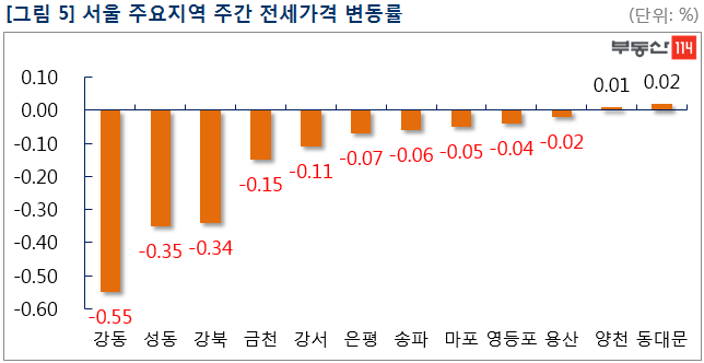 세부적으로 살펴보면 서울은 세밑한파로 전세 수요가 크게 줄면서 ▲강동(-0.55%) ▲성동(-0.35%) ▲강북(-0.34%) ▲금천(-0.15%) 등이 하락했다. ▲동대문(0.02%) ▲양천(0.01%) 등은 소폭 상승했다.