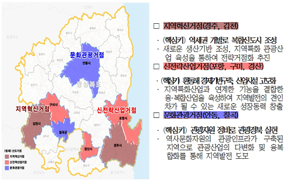 대상지역은 경북 거점지역 7개 시·군 및 종전 사업지역 2개 군이다. 거점지역은 포항·경주·김천·안동·구미·경산시, 칠곡군이며 종전 사업지역은 성주과 고령군이다. 신경주, 김천(구미) 역세권 개발사업을 통해 네트워크형 광역교통체계를 구축하고, 복합기능의 신도시를 조성해 지역 발전을 선도하는 거점지역으로 육성한다는 계획이다.