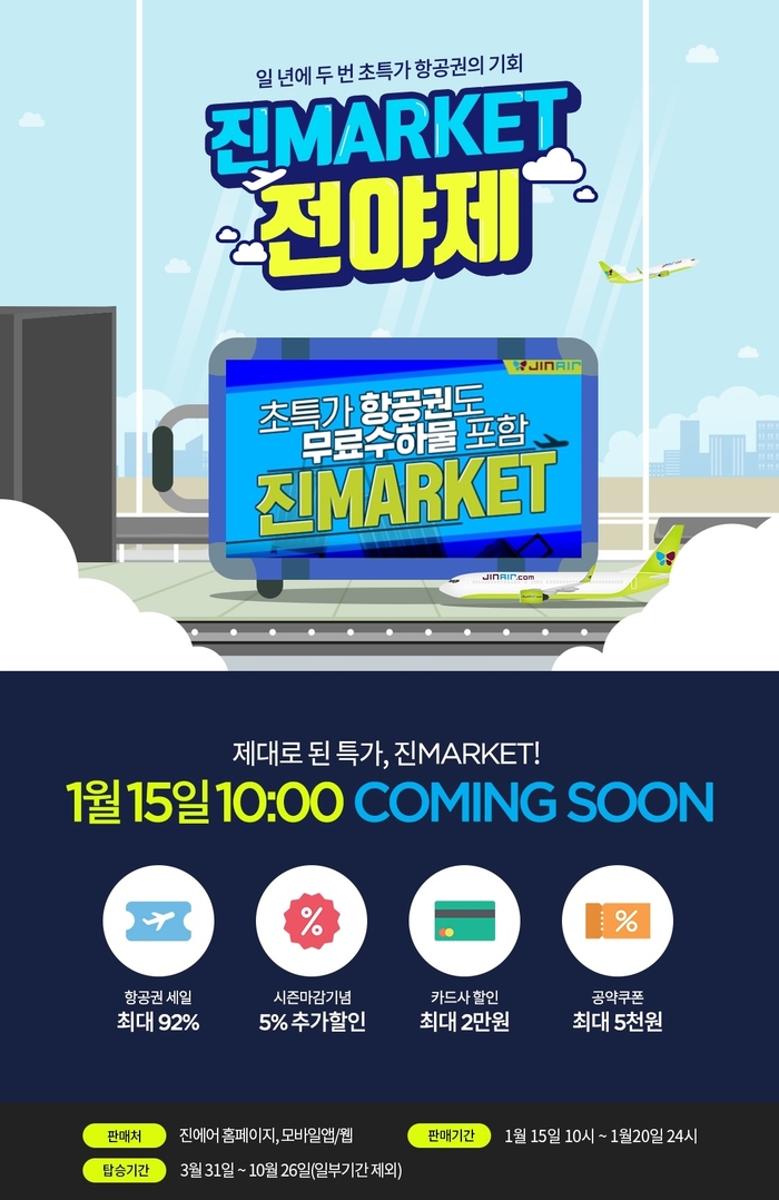 진에어가 연중 최대 규모의 온라인 특가 기획전인 2019년 상반기 진마켓(진MARKET) 티저 페이지 오픈과 함께 사전 이벤트를 오는 13일까지 진행한다.