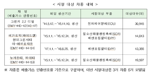 리콜 대상 차량은 2014년 5월12일부터 2016년 11월10일까지 생산된 그랜저 2.2 디젤 3만945대, 2015년 1월 일부터 2018년 8월26일까지 생산된 메가트럭(와이드캡) 2만8179대, 마이티 1만9597대 등 3개 차종 6개 모델 총 7만8721대다.