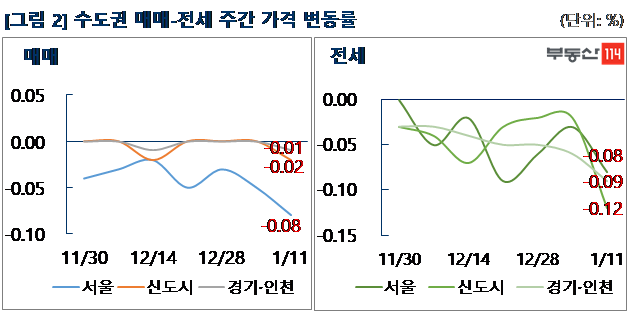 경기·인천은 ▲광명(-0.15%) ▲파주(-0.12%) ▲안산(-0.04%) ▲고양(-0.03%) ▲수원(-0.02%) 순으로 하락했다.