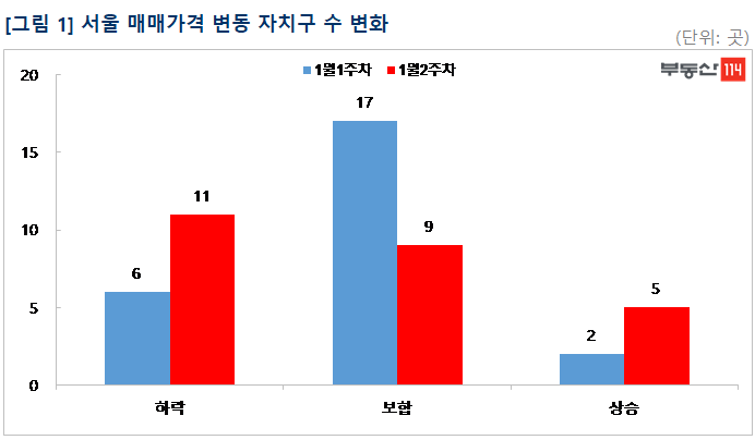 서울에서 매매가격이 마이너스 전환되는 지역이 속속 확대되는 등 9주 연속 하락세를 이어갔다. 지난 주 서울 25개 구 중 매매가격이 약세를 기록한 곳은 6곳에 불과했지만 이번 주에는 11곳이 떨어졌다. 한 주 사이 약세를 기록한 지역이 2배 가량 늘어난 셈이다.
