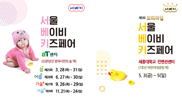 임신·출산·육아 박람회 ‘제25회 서울 베이비 키즈 페어(이하 서베키 봄)’가 3월 28일 목요일부터 3월 31일 일요일까지 나흘간 aT센터에서 140개 업체 400여 부스 규모로 개최되며, 현재 참가업체를 모집 중이다. 2019년 서베키는 서울 유아교육 키즈 페어와 동시 개최 되어 임산부부터 학부모까지 다양한 관람객의 관심과 방문이 기대된다.