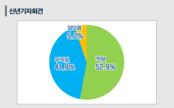 쿠키뉴스의 의뢰로 여론조사업체 조원씨앤아이가 지난 12일부터 14일까지 사흘간 전국 성인남녀 1002명을 대상으로 ‘문재인 대통령의 신년기자회견을 어떻게 생각하느냐’라는 질문에, ‘적절’ 52.9%, ‘부적절’ 41.9%, ‘잘모름’ 5.2%로 응답했다.