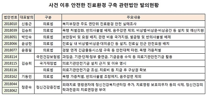 아울러 일련의 불행한 사건이 발생하지 않도록 정부의 지원 아래 비상벨, 비상문 등 보안장치를 설치하고, 의료인의 신변보호를 위해 보안요원을 진료실 인근 등에 추가 배치하거나 경찰과의 연계를 통한 긴급출동시스템을 갖추도록 하는 내용을 담은 법안들도 다수였다.
