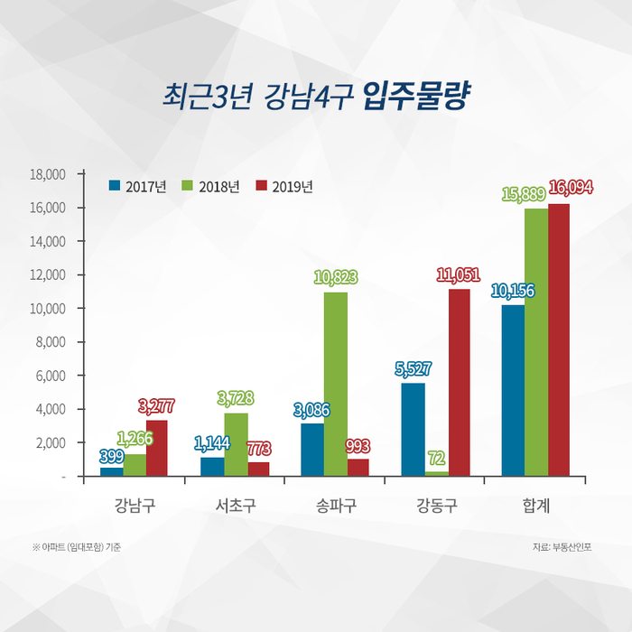 구별로는 강동구가 1만1051가구로 가장 많은 물량이 입주한다. 이어서 강남구가 3277가구, 송파구 992가구, 서초구 773가구 순이다.