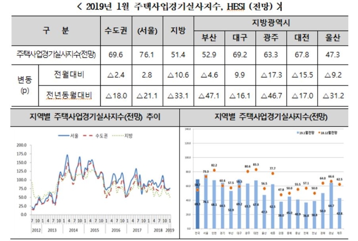 주산연은 “서울, 경기, 대구의 경우, 1월 HBSI 전망치가 상승하며 다른 지역보다 주택사업경기가 개선될 것으로 보인다”면서도 “최고 전망치가 70선에 그치는 등 여전히 전반적인 주택사업경기는 어려움이 지속될 것”이라고 분석했다.
