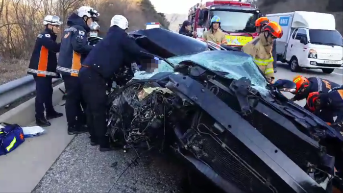 지난 21일 오후 3시32분께 함양군 서하면 대전통영고속도로 지곡IC~서상 IC 대전 방향 116㎞지점에서 체어맨 승용차가 앞서 달리던 25t 트럭을 뒤에서 들이받았다.