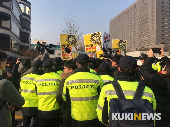 이날 법원 앞에서는 양 전 대법원장에 대한 영장 발부 찬반을 두고 보수, 진보 시민단체 사이 마찰이 일어났다. 전국공무원노동조합(노동조합)은 “사법부가 국민들의 목소리를 무시하고 구속영장을 기각한다면 신뢰를 회복할 기회를 스스로 저버리는 것”이라고 전했다. 반면 자유연대, 자유대한호국단, 턴라이트 등 보수단체는 “사법부가 수모를 당하는 날”이라며 “윤석열 사단이 작당을 꾸미고 있다”고 주장했다. 두 단체가 충돌할 뻔한 아찔한 상황이 벌어지기도 했다. ‘부당한 재판거래’라는 팻말을 든 노동조합 관계자들이 보수단체 측으로 돌진했으나, 현장에 투입된 의경이 이를 저지, 상황은 일단락됐다.