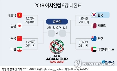 반대편 8강 대진에서는 박항서 감독이 이끄는 베트남이 24일 오후 10시 일본과 맞대결을 펼친다. 이어 25일 오전 1시에는 중국과 우승 후보 이란이 경기를 갖는다.