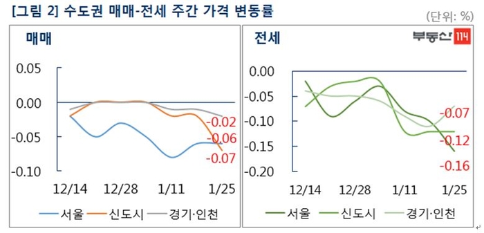 신도시는 ▲동탄(-0.29%) ▲위례(-0.26%) ▲중동(-0.26%) ▲산본(-0.20%) ▲평촌(-0.15%) ▲분당(-0.11%) 순으로 하락했다. 경기·인천은 ▲의왕(-0.53%) ▲성남(-0.49%) ▲과천(-0.36%) ▲광명(-0.23%) ▲양주(-0.21%) 등의 하락폭이 컸다.