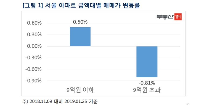 25일 부동산114에 따르면 지난해 11월9일~1월25일 11주 동안의 서울 아파트값 누적 변동률은 -0.23%로 집계됐다. 금액대별로는 9억원 이하 아파트가 0.50% 오른 반면, 9억원이 넘는 고가 아파트는 0.81% 떨어졌다.