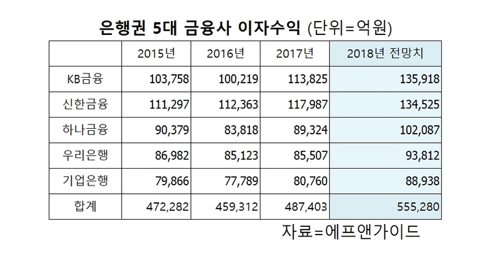실제 이들 5개 금융사의 이자수익은 2015년 47조원에서 2016년 46조원, 2017년 49조원 수준을 기록한 가운데 지난해 급격히 증가해 55조5000억원을 넘어설 것으로 전망됐다.