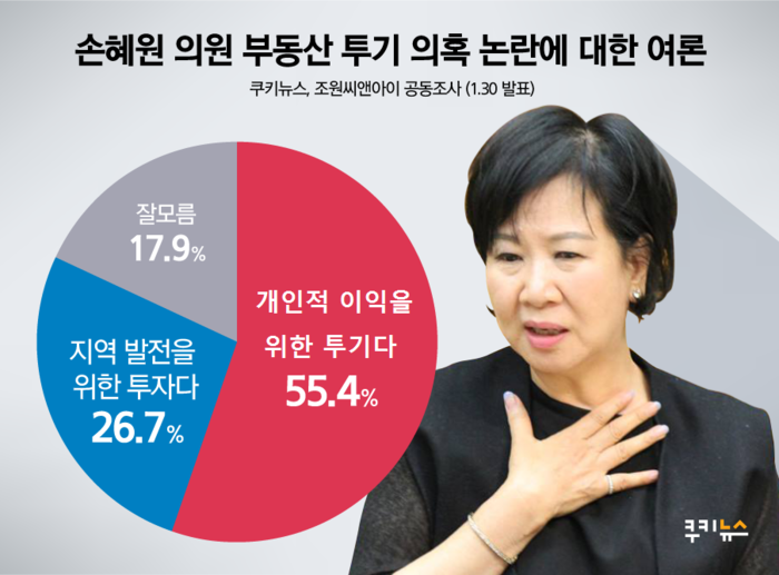 쿠키뉴스의 의뢰로 여론조사업체 조원씨앤아이가 지난 26일부터 28일까지 사흘간 전국 성인남녀 1002명을 대상으로 ‘손혜원 의원의 전남 목포 부동산 투기 의혹’에 대해 조사한 결과, 응답자 가운데 55.4%가 ‘개인적 이익을 위한 투기’라고 답했다.