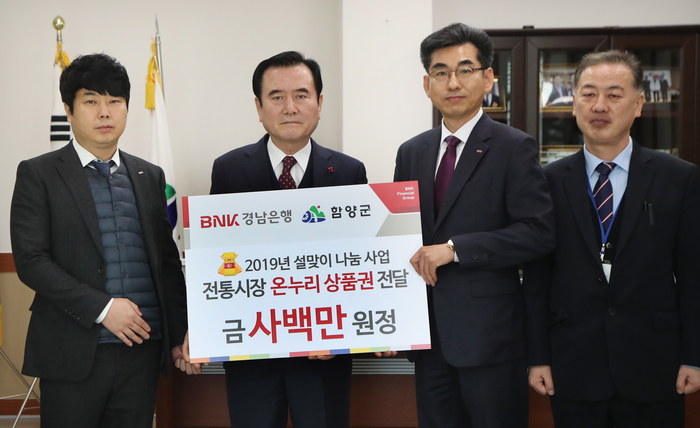 경남 함양군은 29일 BNK경남은행 함양지점이 설 명절을 맞아 온누리상품권 80매(400만원 상당)를 군에 기탁했다고 밝혔다.